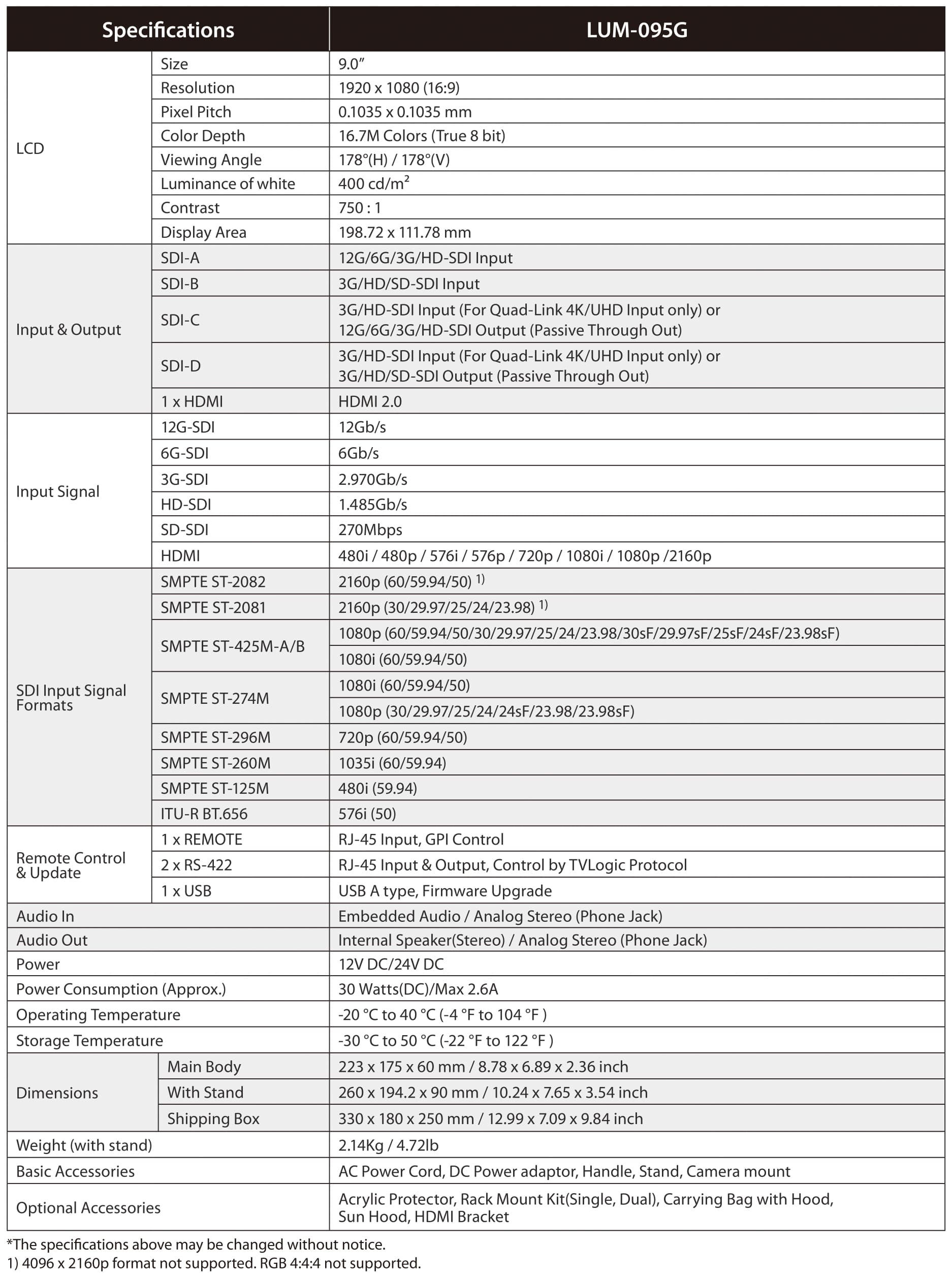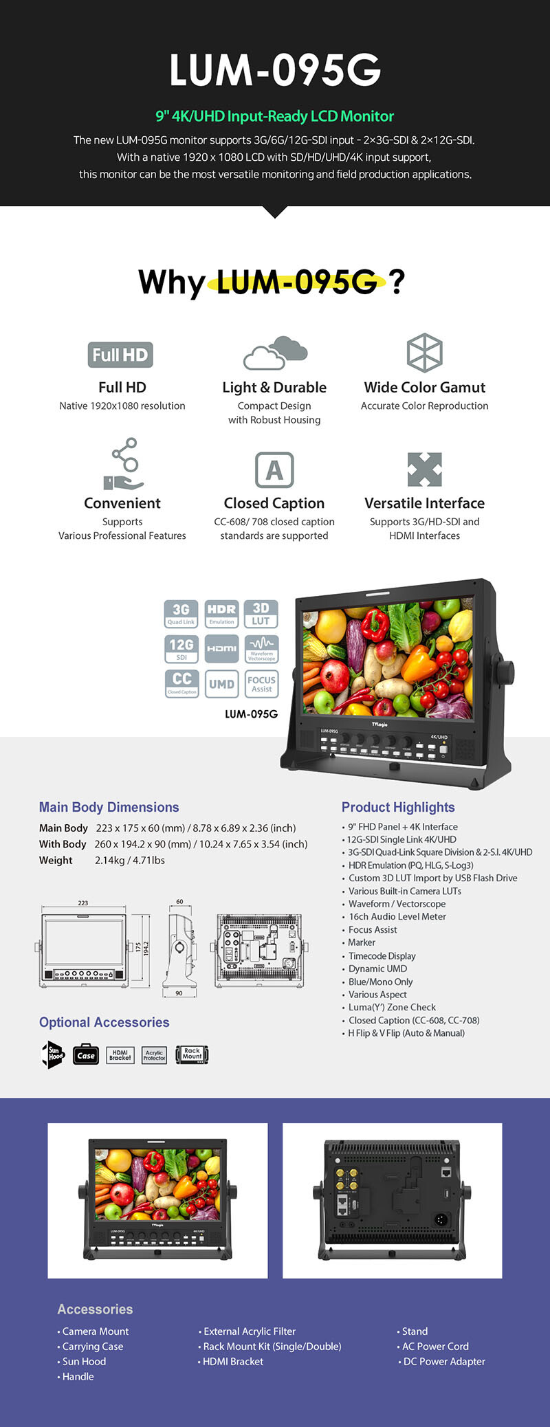 티비로직 LUM-095G 9인치 4K UHD 인아웃풋 방송용 모니터