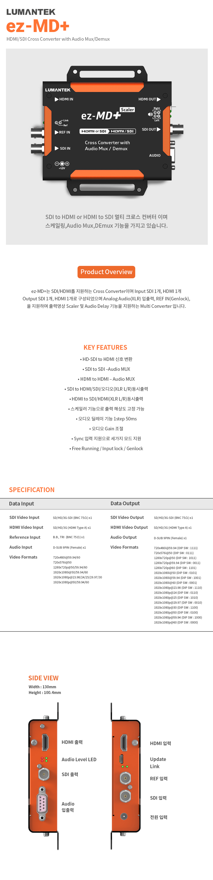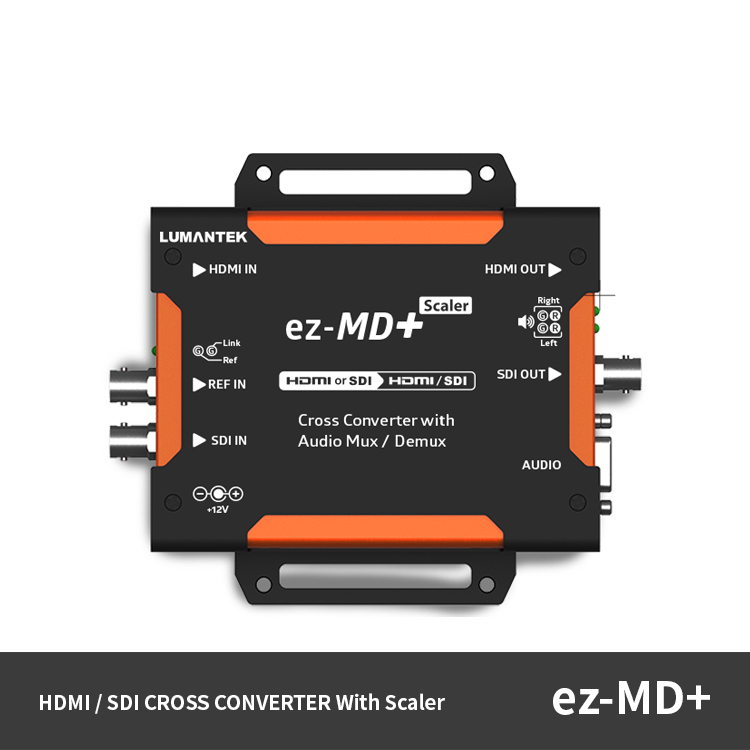 SDI/HDMI를 지원하여 Cross Converter이며 Input SDI 1개, HDMI 1개, Output SDI 1개, HDMI1개로 구성되었으며 Analog Audio (XLR) 입출력, REF IN(Genlock)을 지원하며 출력영상 Scaler 및 Audio Delay 기능을 지원하는 Multi Converter입니다.