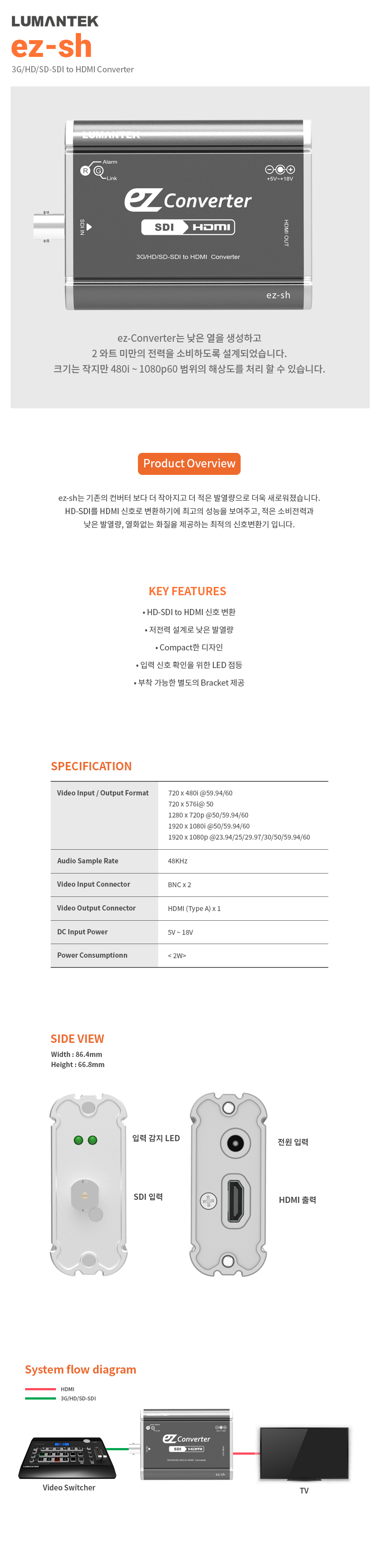 HD-SDI를 HDMI 신호로 변환하기에 최고의 성능을 보여주고, 적은 소비전력과 낮은 발열량, 열화없는 화질을 제공하는 최적의 신호변환기 입니다.