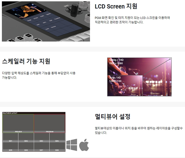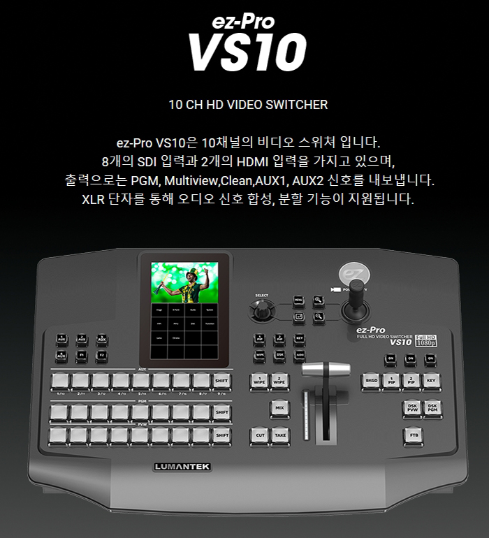 8CH의 HD-SDI 입력과 2CH의 HDMI 입력을 지원하는 VS10은 기존의 스위처들이 가져야 할 기능뿐만 아니라 카메라 컨트롤러 기능, LCD 터치 스크린 지원, 10채널의 확장된 입력을 통해 스튜디오에서 독보적인 성능을 자랑합니다.