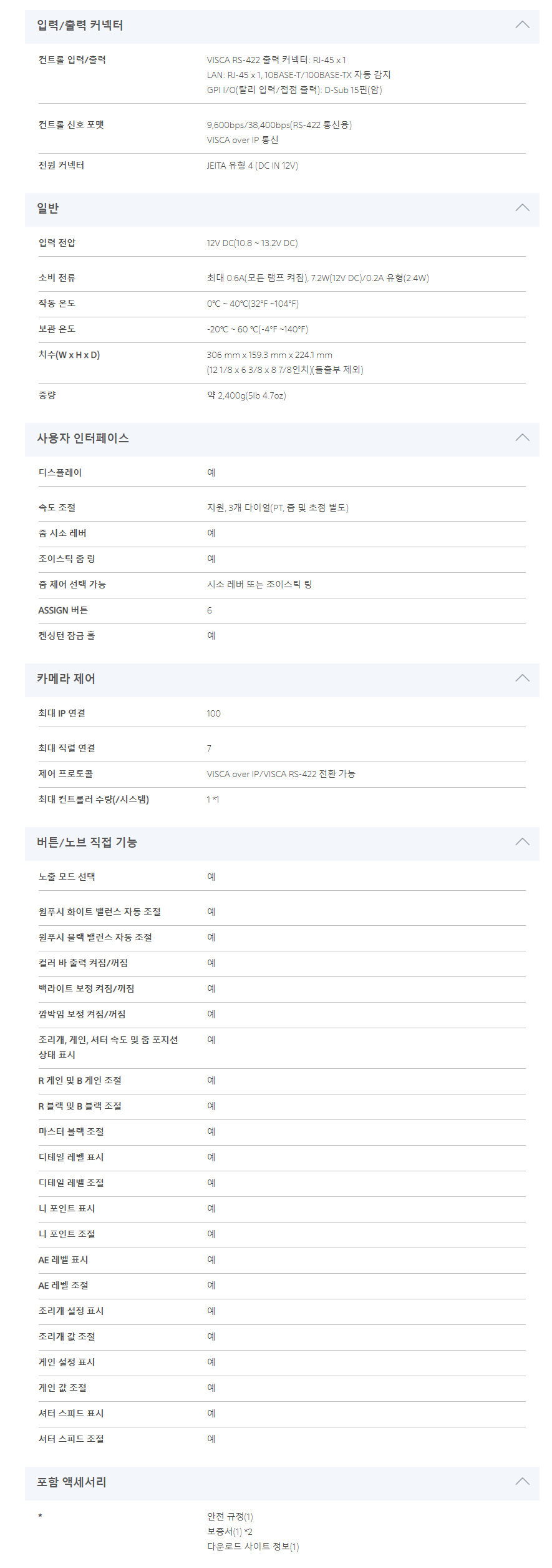 리모콘으로 팬, 틸트, 줌 제어 및 다른 기능을 사용할 수 있으며, IP 네트워크를 통해 최대 100대의 소니 BRC 또는 SRG 시리즈 PTZ 카메라를 제어할 수 있습니다.